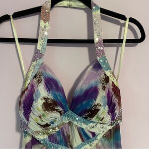 B Darlin Prom Dress Size 9 10 Halter Beaded Satin Maxi Purple Blue Chiffon