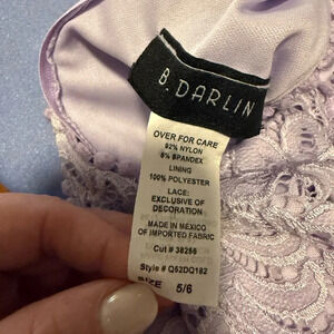 This knee-length dress by B Darlin features a sleeveless halter neckline and a ruffled, embellished style in a soft lavender color.