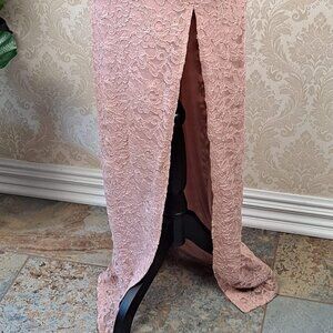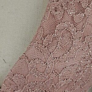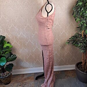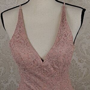 Rose pink lace gown has an all over sparkle with a vneck and a racing back design. Defined waist. Front slit. Floor length. Fully lined skirt and front torso. Hidden back zip from waist to just below the neck - please note that due to the small size, it did not fit the size 4-6 mannequin correctly. The last pictures show that the zipper does indeed close.