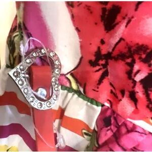 Channel your inner 2000s queen with this B. Darlin strapless dress! Bold floral stripe print, rhinestone heart buckle belt, and partial tulle lining give total Y2K party vibes. New without tags. One hanger strap is tied. Size tag missing—fits like a Medium based on measurements.