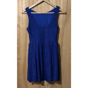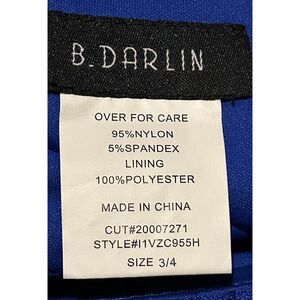 The B. Darlin Women's Blue Party Mini Fit & Flare Dress in size 3/4 is a stylish and flirty piece perfect for weddings and parties. The sleeveless design with a round neckline and zip closure adds a touch of sophistication. Made of a comfortable and stretchy polyester, nylon, and spandex blend, this dress also features a lace fabric type for added charm. The short dress length and fit & flare style make it a flattering and trendy choice for any season. Hand wash only to keep this beautiful dress looking its best.