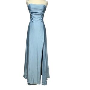Elegant B Darlin formal maxi dress in a stunning light blue satin-like fabric. Features adjustable spaghetti straps, ruched bust detail, an open lace-up back, and a stylish side slit. Perfect for prom, bridesmaids, evening parties, or any special occasion. Item Details: • Brand: B Darlin • Size: 13/14 (Juniors) • Color: Light Blue (satin finish) • Condition: New With Tags (NWT) • Style: Maxi / Floor Length • Material: 85% Polyester, 15% Spandex • Lining: 100% Polyester • Closure: Back zipper + lace-up tie back • Made in: China Features: • Elegant and flattering fit • Soft, stretchy fabric • Open lace-up back • Perfect for formal and semi-formal occasions