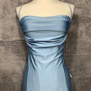 B Darlin Women’s Blue Satin Maxi Dress Size 13/14 Spaghetti Straps Open Back Sid