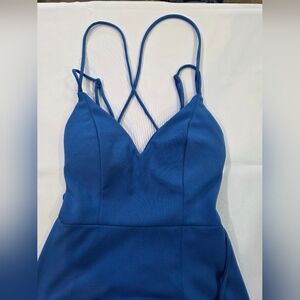 Womens Blue Zippered Lined Lace-up Open Back Thigh-hi Slit Spaghetti Strap V Neck Full-Length Formal Gown Dress. pre-owned in good conditions.