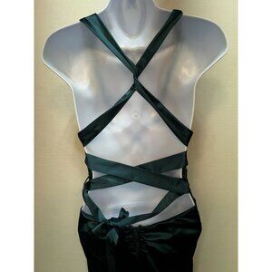 Enhance your wardrobe with this striking emerald green mini dress. Its satin finish and criss-cross back straps create an elegant and captivating look for evening wear.