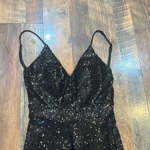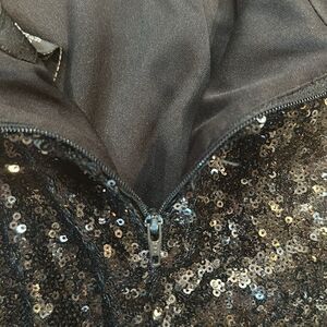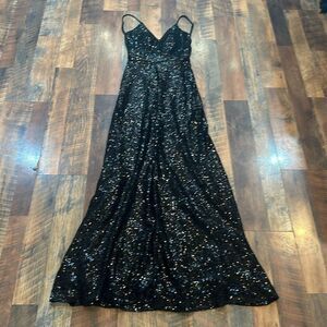 Gorgeous black sequin dress with back zipper and adjustable straps. The stunning dress measures 16 inches pit to pit. It’s approximately 60 inches long. The waste measures 12 inches across laying flat.