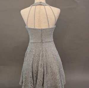 Shimmer and shine in this gorgeous silver lace halter dress! The elegant high neckline and fit-and-flare silhouette create a flattering shape, while the subtle sparkle in the lace overlay makes it perfect for any special occasion.Sparkle Dress