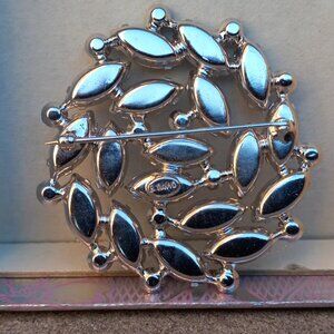 This Exemplar in its Original B. David Box (Purple Floral w Velvet Side Ribbon) Includes a splashy Brooch and matching Clip earrings. The Box maintains its original B. David Marketing branding. Each of three pieces in this set is signed B. David on its rear side. The stones are a lively combination of blue toned Aurora Borealis and clear crystals. The brooch as a diameter of 51.6mm or 2.03". This is a wonderful gift or addition to a personal collection.