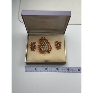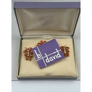B. David Vintage Brooch & Clip On Earrings Orange Rhinestone Original Box
