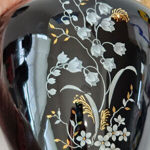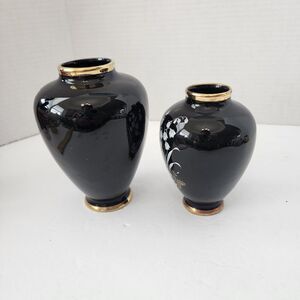 This beautiful set of two German vases from B H Geschenke is a perfect addition to any collection. The vases feature exquisite floral designs with intricate hand-painted details on a high-gloss finish. The shell pattern and Asian style make them unique and elegant decorative pieces. Measuring at 4.5" for the small vase and 5.5" for the large vase, they are perfect for displaying flowers or as standalone decorative items. The vases are signed by the artist and have a printed backstamp, ensuring their authenticity. Made in Germany during the mid-20th century, these original art pottery pieces are a rare find.