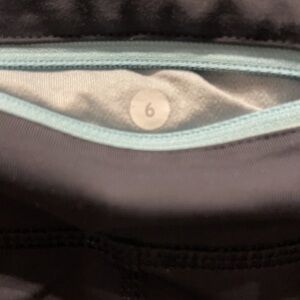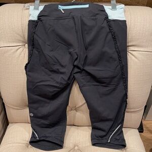 B: Lululemon Sz 6 Run Fast and Free Crop Leggings Black Teal ruffle accent