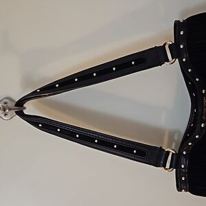 Add a touch of the Wild West to your outfit with this stunning black suede shoulder bag from B. Makowsky. The bag features fringe accents and a tassel, making it the perfect accessory for any bohemian or designer-inspired ensemble. The medium-sized bag is made of high-quality leather, ensuring durability and longevity.