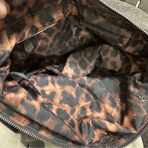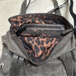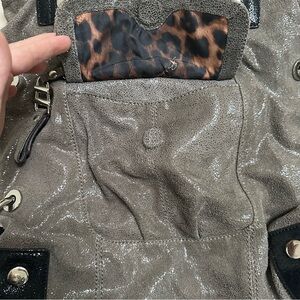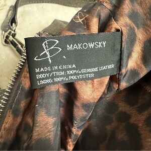 Awesome B. MAKOWSKY large shimmery, shiny textured LEATHER handbag / shoulder bag / satchel / hobo / cross body / boho / saddle bag / purse / tote / shopper / carryall, very urban / hipster / funky with signature metal hardware, plus signature leopard print lining and label. Measures approx 16" tall, 2.75" deep, 14.25" long, and 7.5" short strap drop, detachable, adjustable longer strap drop. A gorgeous well-made bag - awesome design!