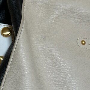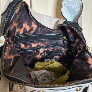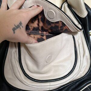 A vintage black, cream, and white B. Makowsky genuine leather handbag. Absolutely lovely, this one. Measures approximately 12"L x 154"W with a ~16" strap. No attachable crossbody strap included. No dustbag included. Has a few minor imperfections/scuffs in the leather (pictured). Hardware is gold and in great condition. Has a rectangular bottom but no 'feet'. Has an external pouch with a magnet fasten as well as several internal zip pouches and sections. Has one card slip slot on the back. Fastens shut with a zipper.