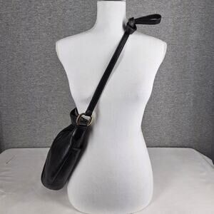 Elegant and functional B. Makowsky bucket-style hobo purse in soft black pebbled leather. Features a structured silhouette with pleated front detail, gold-tone turn-lock closure, and a single crossbody strap.
