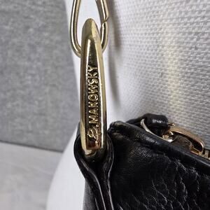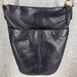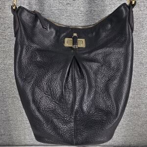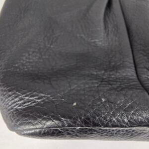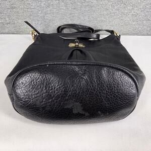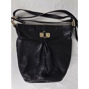 Elegant and functional B. Makowsky bucket-style hobo purse in soft black pebbled leather. Features a structured silhouette with pleated front detail, gold-tone turn-lock closure, and a single crossbody strap.