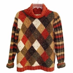 B. MOSS Argyle Tweed Striped Wool Blend Chunky Turtleneck Sweater Medium Y2K