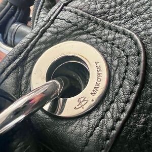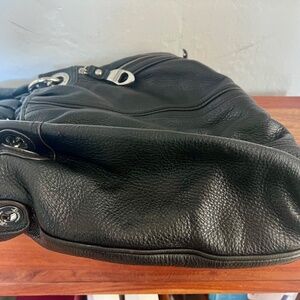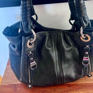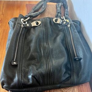 Black leather handbag with leopard interior material and multiple silver finish treatments, including silver zippers. Used but in good condition.