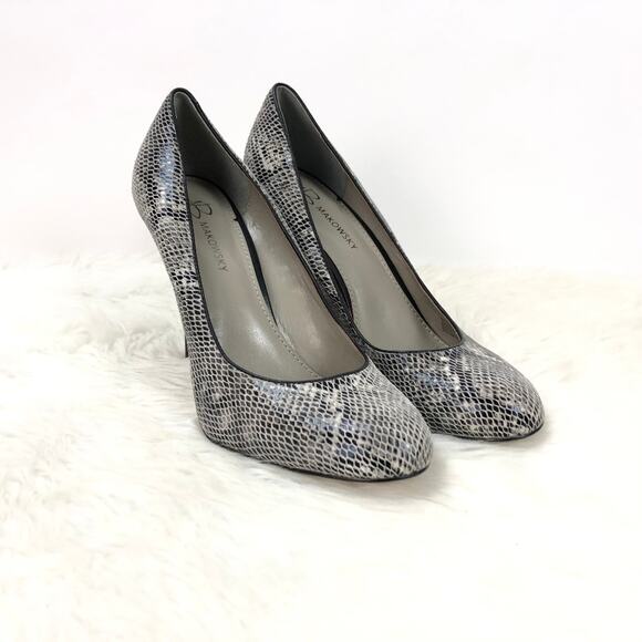 B Makowsky 9.5 M Womens Gray Python Print Leather Neve Heels 5 inches tall This has been gently worn with no major flaws. Please refer to photos for more details. *Due to camera exposure, some listings may have a color variation that may differ from the photos. Please ask all questions if color is a concern. Thanks!