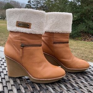 Preloved but lots of life left! Some cracking in leather lining of right boot. Some creasing and scuffs in leather on both boots. And a few very minor darker spots. The rubber wedge and trim shows wear. A few yellowing areas in the Sherpa from the glue used in manufacturing and some light wear to soles. Sounds like a lot but honestly when wearing they still look fabulous!