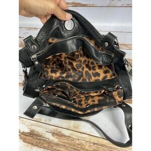 Elevate your style with the B. Makowsky Black Pebble Leather Bag, featuring a bold leopard/cheetah lining, a chic accessory perfect for everyday use, travel, or adding a touch of sophistication to your wardrobe.