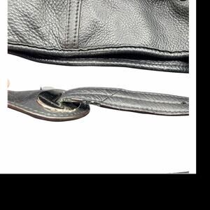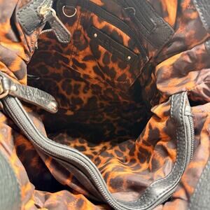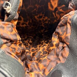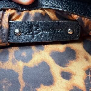 Chic B. Makowsky black pebbled leather hobo with silver hardware, belted detail, and signature leopard-print lining. Soft, slouchy silhouette with wide comfortable shoulder strap. Interior zip + slip pockets. Approx. 14” H × 10” W × 5” D with ~10–11” strap drop (see photos). Preloved and in great condition with light wear typical of soft leather.