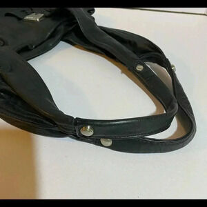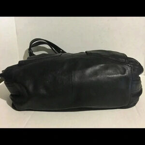 Authentic B. Makowsky Black leather satchel handbag with silver tone hardware 3 compartment 1 zip pocket at center 3 pockets at interior wall 1 zip closure & snap closure at top 2 side pockets green satin fabric lining small stain at lining please check all photos hight 11” width 16” depth 7” Strap drop 12” Bag dimensions are based on approximate measurements.