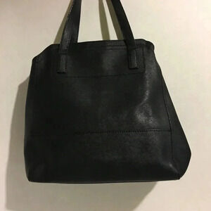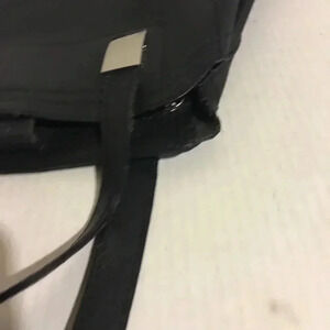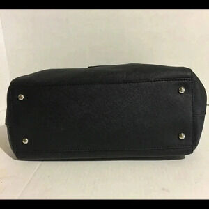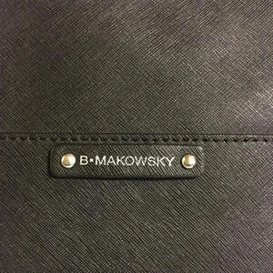 Authentic B. Makowsky Black saffiano leather satchel handbag with silver tone hardware raw suede lining main compartment 1 zip pocket closure at interior wall & magnetic snap closure at top logo at front protective metal foot lining have some pin marks strap & Edges have minor cracks please check all photos hight 13” width 18” depth 5” Strap drop 9” Bag dimensions are based on approximate measurements.