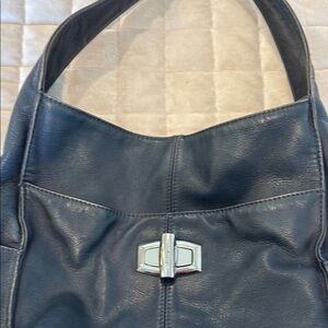 This elegant shoulder bag by B. Makowsky showcases a chic blue design with a slouchy silhouette, ideal for everyday use. Crafted from high-quality materials, it features a distinctive silver-toned turnlock closure for added sophistication. The single shoulder strap offers comfortable wear, making it a versatile accessory for any occasion.