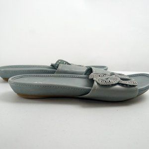These original leather slides are in excellent unused, like-new condition. The shade is a dusty powder blue, and the bottoms have a nice cushion. Leather upper, balance man made.