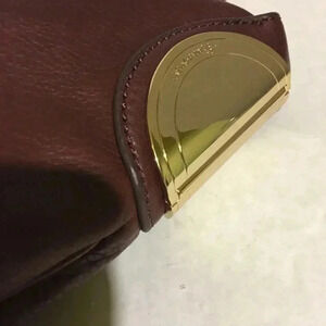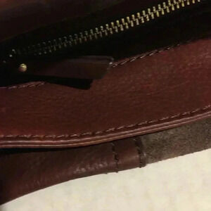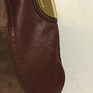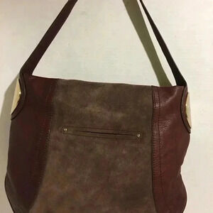 Authentic B. Makowsky Brown suede/ Burgundy leather hobo handbag with metal badges on both side with gold tone hardware 2 compartment 3 pockets at interior wall 1 pin slots & zip & snap closure at top minor scratches please check all photos hight 12” width 14.75” depth 1” Strap drop 14” Bag dimensions are based on approximate measurements.