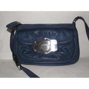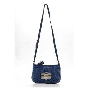 B Makowsky Denim Blue and Leather Crossbody With Bold Chrome Accents