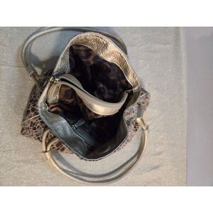 B. Makowsky Gold Snakeskin Print Linen Satchel Purse. Logo Leather Print Interior. 3 interior compartments: 2 open and 1 Zipper Pocket. Magnet Closure. Body: Linen. Trim: Leather. Lining; Polyester. Width: 15"; Height: 11" (measurements approximate).Great used condition: some signs of wear on the hardware.