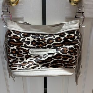 B Makowsky Shoulder Bag, Genuine Leather and Cow Hair, Excellent Condition, Like New, Animal Print, Silver Hardware w/bottom feet, Fringe on Sides, inside has leopard print, middle dividing pocket with zipper, small outside pocket on the back of bag. Soft leather