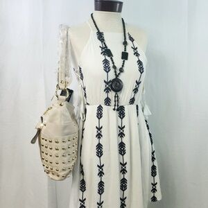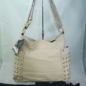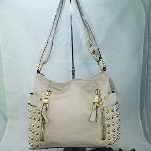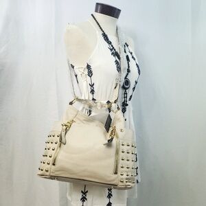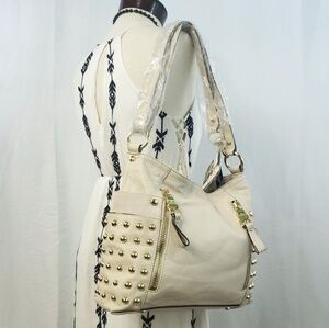 This a beautiful B Makowsky Leather Shoulder Messenger Bag/Crossbody Bag. This can be switched to crossbody without unclipping or modifying the shoulder strap. New With Tags. Color is a beautiful winter white with gold studs.