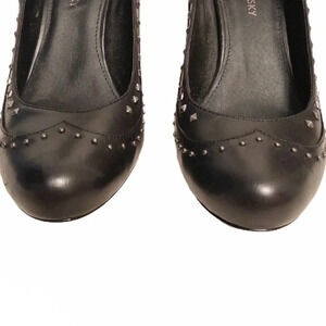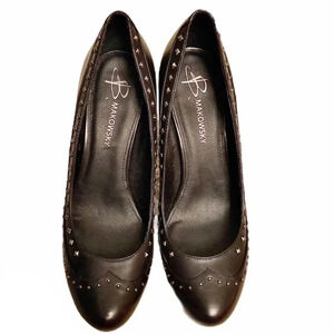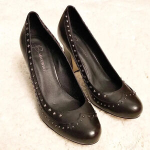 B. Makowsky, leather, studded, black, high heel round toe shoes.