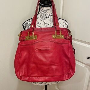 This is a B Makowsky red leather purse. It is in good used condition. It does have some flaws, please see photos. The price is reflective of the flaws. It is soft and luxurious. Very classy.