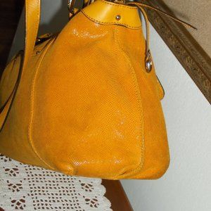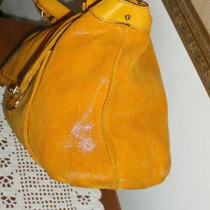 Interior is neutral leopard-print lining, back-wall zip pocket, three front-wall slip pockets. Long strap is not removable. Body/trim 100% leather; lining 100% polyester. Smoke free home. Please check out my other items. Warm golden yellow color.