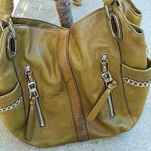 HUGE MARK DOWN..Beautiful leather bag. Excellent Used condition except for some marks on front of bag. see first pic. Still a great bag. Olive green and silver hardware. Magnetic closure, several compartments inside and out. B.Makowsky signature lining. Inside in excellent condition.