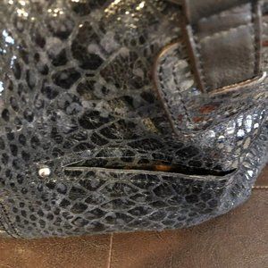 Elegant black leather handbag from B. Makowsky. Features a unique snake embossed design with stylish studs for an edgy look. Perfect for accessorizing your outfit for any occasion.