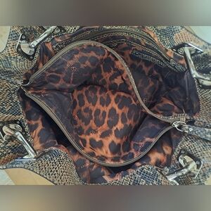 Gorgeous and roomy B. Makowsky handbag in a snakeskin embossed leather design with silver-tone hardware. Features dual shoulder straps with stud and ring details, and a striking leopard-print interior lining with multiple compartments for organization.