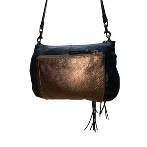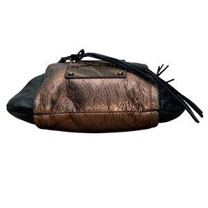 Sleek crossbody bag with black and metallic bronze leather. Fringe details, animal print lining, and adjustable strap. Stylish yet functional for daily essentials.