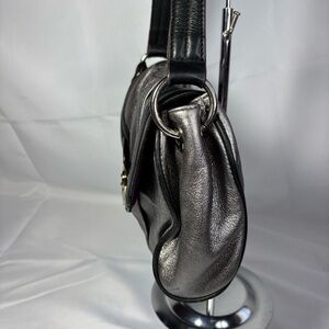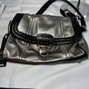 • Design: Metallic silver body with black leather trim, a front flap with a flat lock closure and a non adjustable shoulder strap.