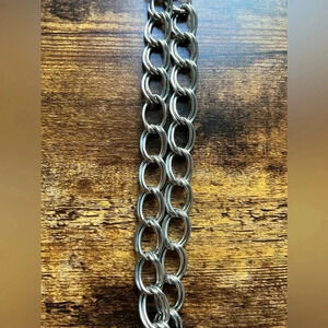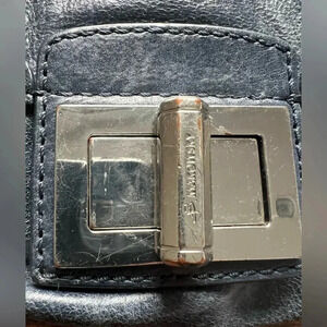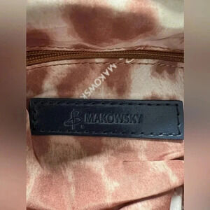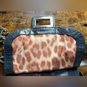 Beautiful woman’s leather & chain purse. The front has a flap over closure with a turn lock closure. The interior is lined with tan animal print B. Makowsky logo fabric. There is one zipper closure pocket with a B. Makowsky leather logo tag. .75” wide partially leather partially silver metal chain shoulder straps. Very good, used condition.