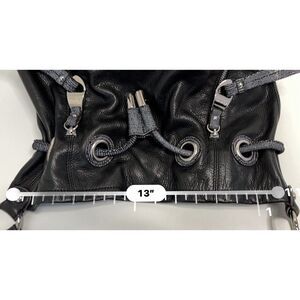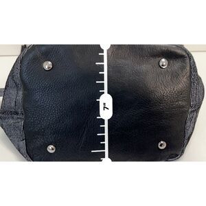Metallic and muted blue snake print leather accents are contrasted against black leather on this bag