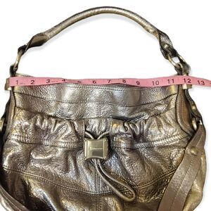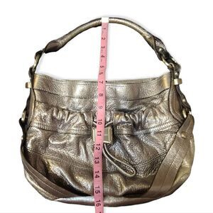 B. Makowsky Silver Metallic Leather Hobo Bag, front pocket has magnetic closure, i terior also has magnetic closure, interior zipper pocket.