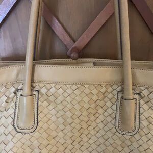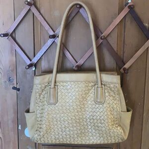 B Makowsky saddle color leather in basket weave design and outer side pockets. Has dual leather handle straps and footed bottom. Top snap tab closure. Signature leopard lining with middle zipper compartment and outer compartments. Zipper pocket and 2 slip pockets at interior walls. Bag is in excellent condition with minor leather wear at corner bottoms. Interior is immaculate.