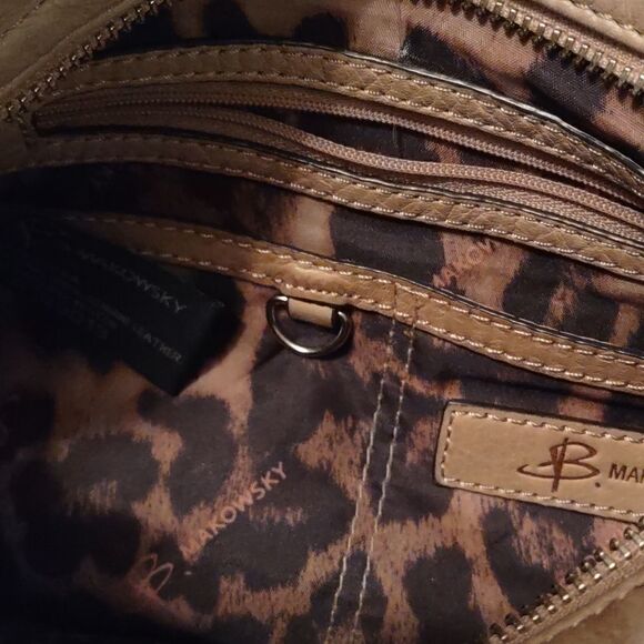 B. Makowski 8x11 leather purse with large stitching, zippered closure, tortoise shell clasp on outside front pocket, cell phone pocket on back, interior has three pockets and animal print lining, 8 in drop strap, super soft, great condition
