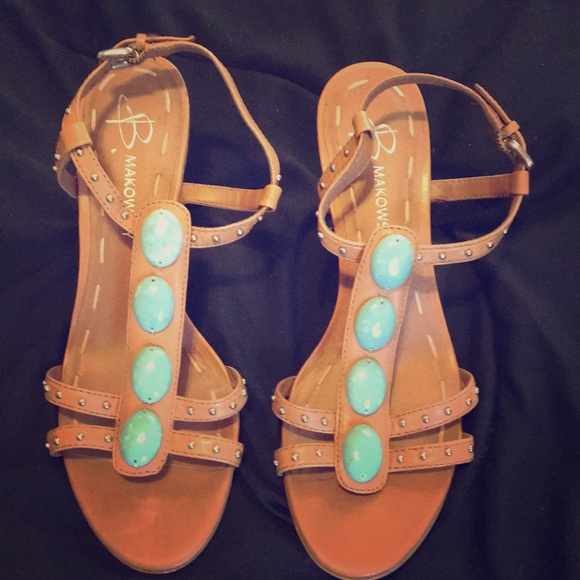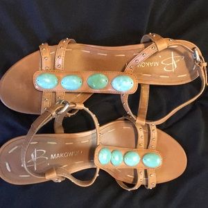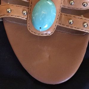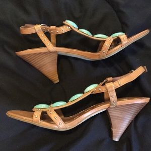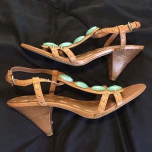 Well loved, turquoise embellished sandal, small heel. Still plenty of life left in them.