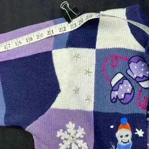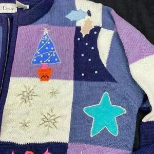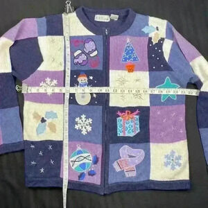 Preowned B.P. Design women’s purple navy blue patchwork winter themed zippered sweater cardigan size large, this garment has gentle signs wear without stains, rips or snags.